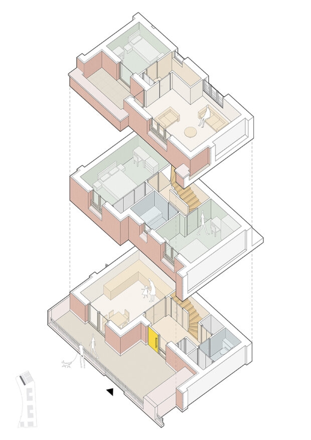 Occupying the centre of the site are two ‘C’ shaped courtyard mansion blocks containing landscaped gardens at their centre which both residents and the public can use. Taking their cue from the historic Peabody mansion buildings, the blocks are carefully articulated to increase the number of dual-aspect dwellings with adjoining private terraces and balconies.