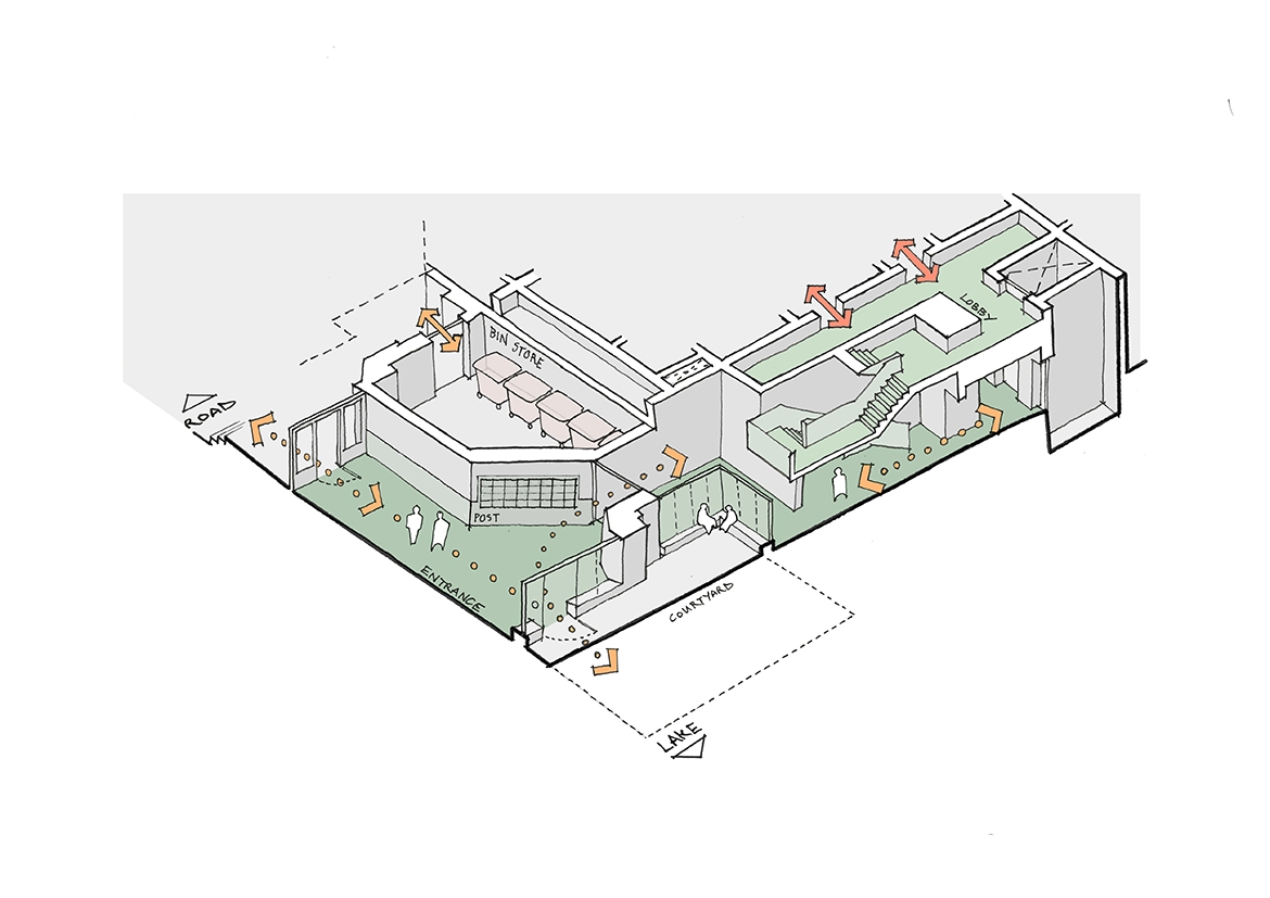 The adoption of fabric first principles including efficient building massing, high-performance building fabric and integrated Air Source Heat pumps to increase energy savings and keep fuel bills low. Throughout the landscape and public realm, a sustainable urban drainage system (SuDS) utilises planted swales to increase bio-diversity and ecologies near to the lake.