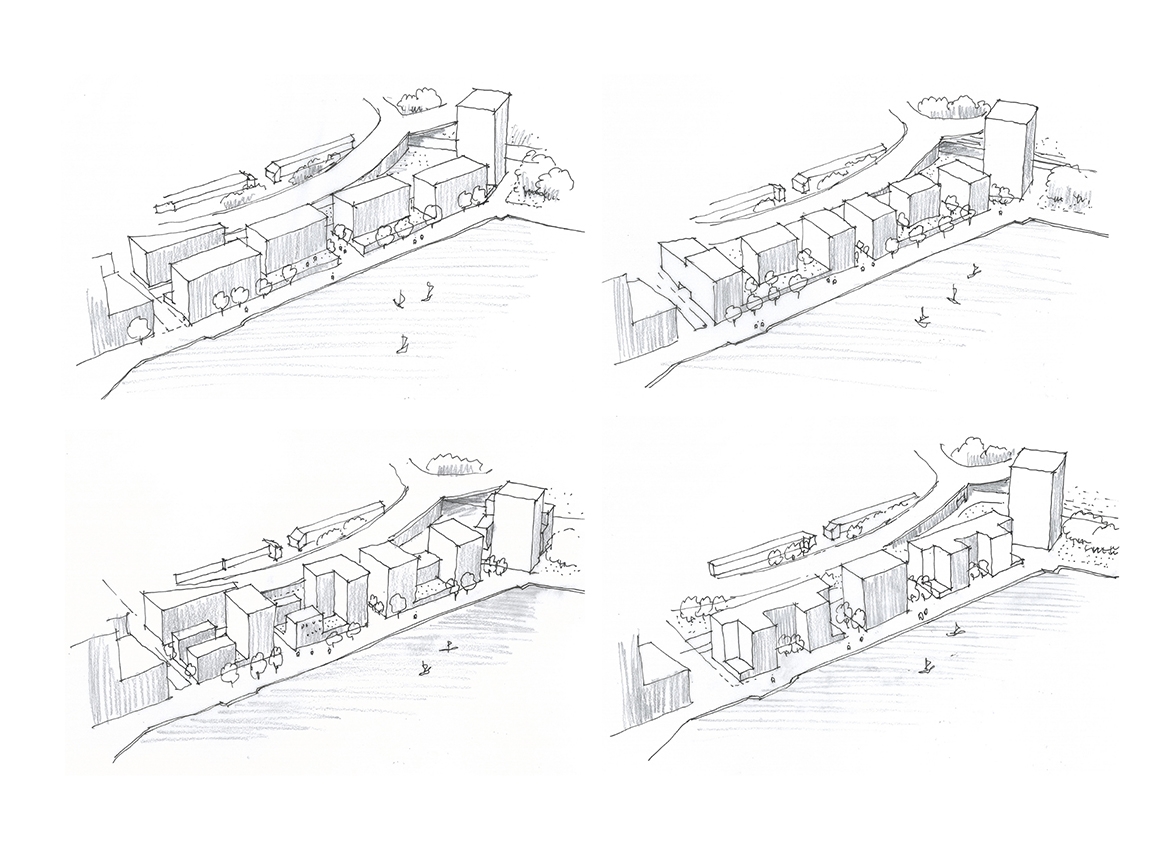 Bookending the site are two taller urban blocks, providing an appropriate step-up to address the urban infrastructure that wraps around the scheme; to the south, an 9-storey block is articulated with cut-away corners and recessed balconies creating light-filled dwellings with sheltered outdoor space overlooking the lake, while to the north, a 17-storey landmark building is positioned to mark the edge of the large site. As this block ascends, a distinctive silhouette is sculpted out by a series of considered cut aways at different levels to visually break-down its massing and create a mix of 1, 2 and 3-bed dwellings.
