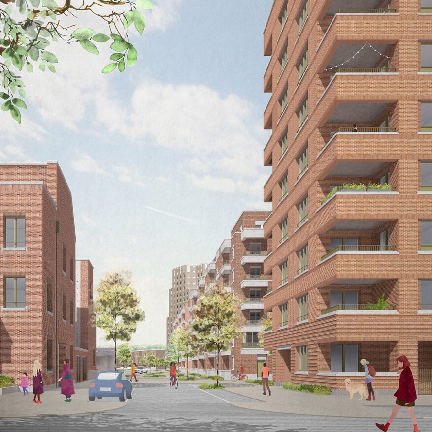 This largely pedestrianised site creates a series of gardens, swales and play spaces linking to a generous public promenade which will allow people to enjoy the waterfront more easily. Using the lake as a focal point, the neighbourhood is formed of a series of elegant brick-built residential buildings configured to front onto the water and provide elevated views from the living spaces.