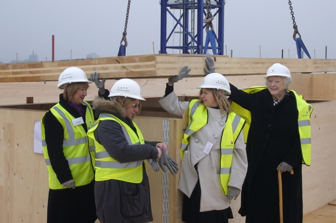 Pat Ritchie, Chief Executive of Homes and Communities Agency joined Maggie and Hilda of the Colville Residents Association (CETRA), Karen Allcock, Deputy Mayor of Hackney at the Topping Out Ceremony on 22nd February for Karakusevic Carson Architects Bridport Place scheme in Hackney.
