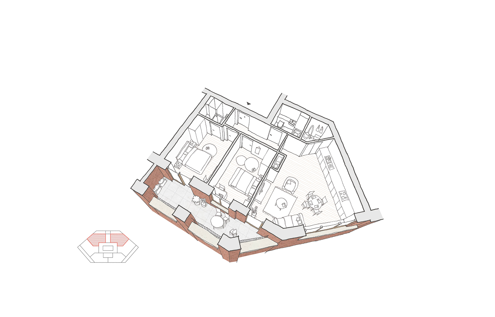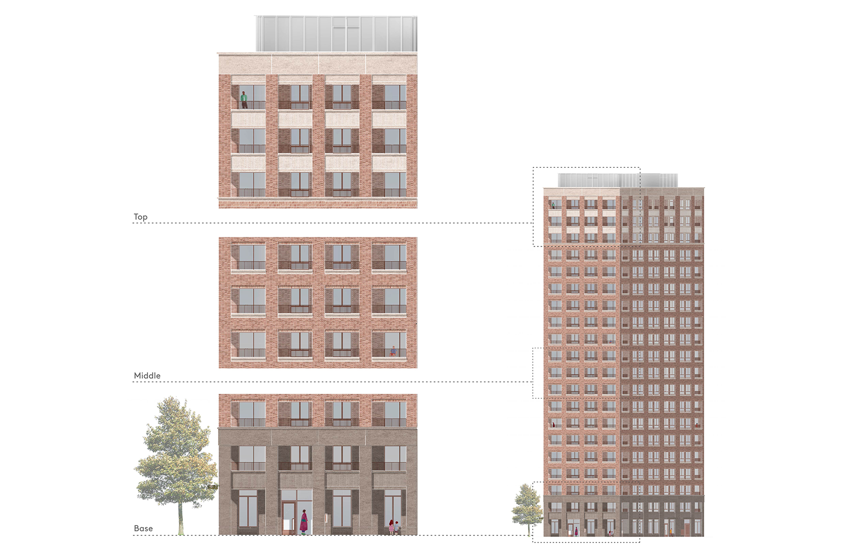 A 20-storey building crafted in warm domestic brick tones addresses the busy Steyne Road to the east containing a mix of 1,2 and 3-bedroom dual-aspect dwellings and a double-height communal lobby located at ground floor. The orientation and shape of this taller building responds to the scale and alignments of the existing estate block to optimise aspect, light and views, while minimising overlooking between the two. Open recessed balconies are carved out on alternate facades, forming an ordered rhythm of open and closed sides which are intentionally off-set with the existing block. These sculptural qualities are carried across the elevations through the presence of deep-set windows and crisp pre-casting detailing which will animate the building with light and shadow throughout the day.