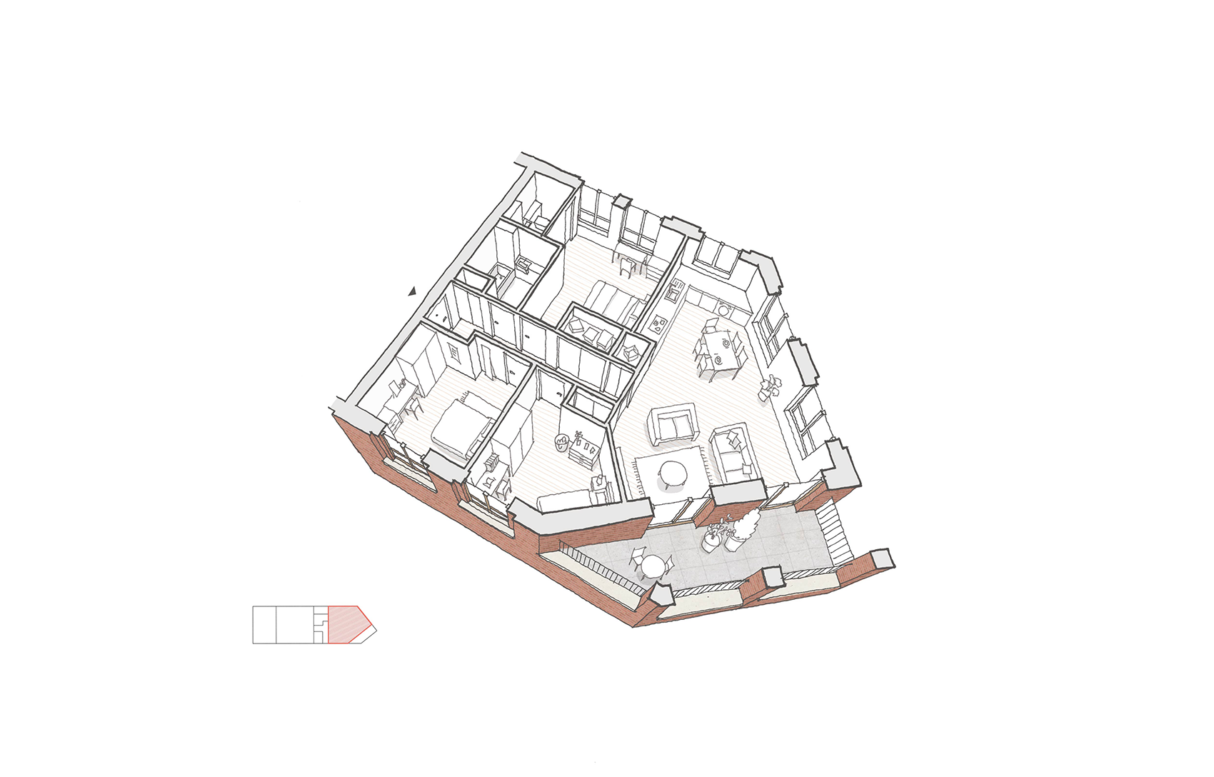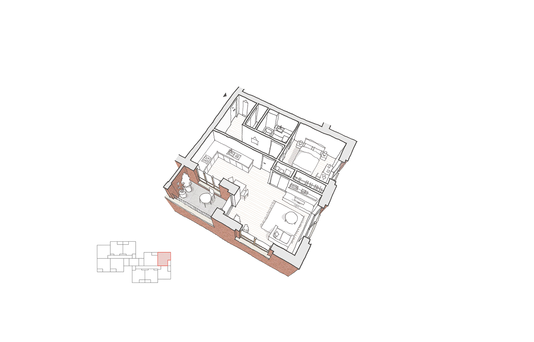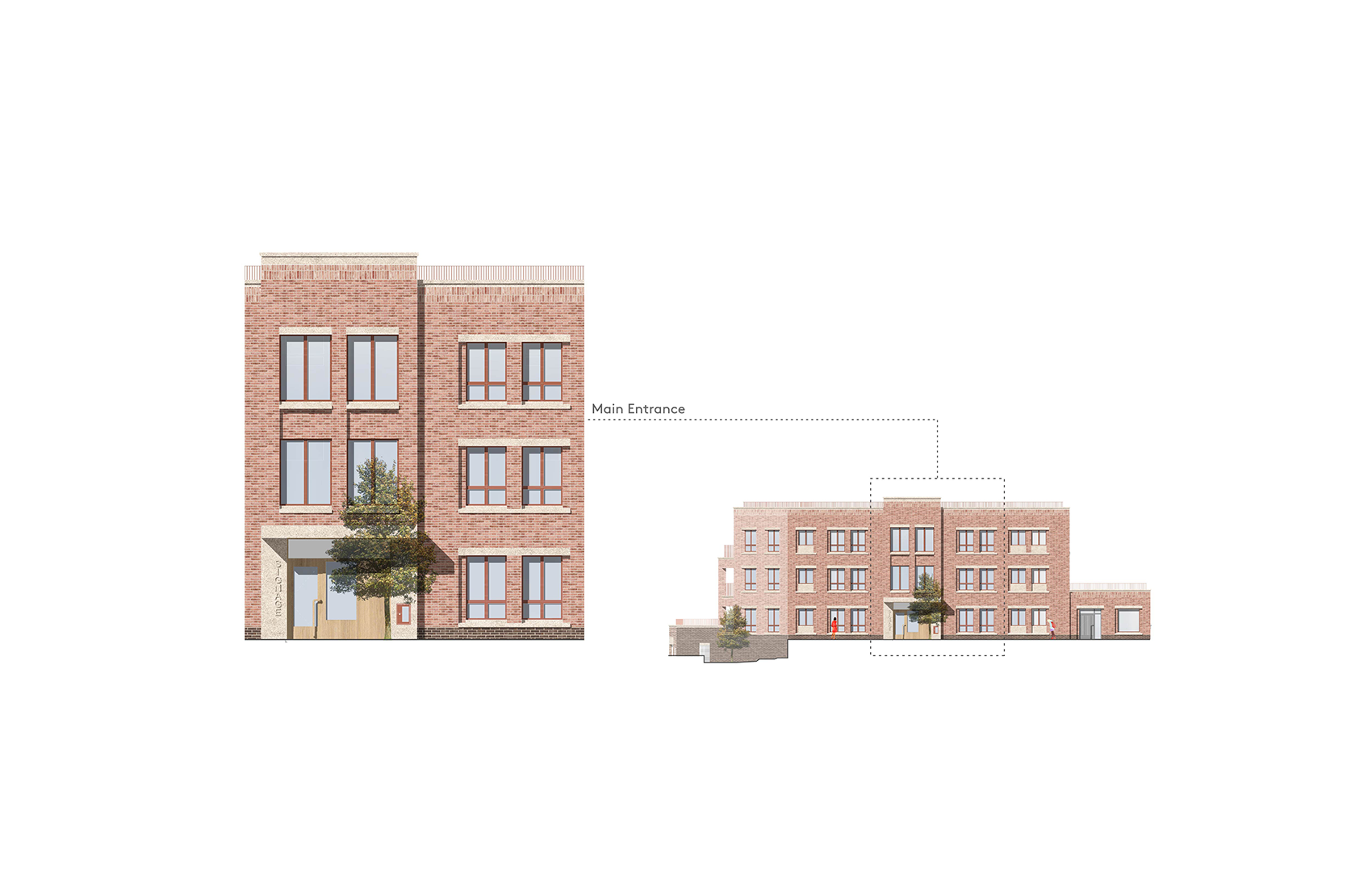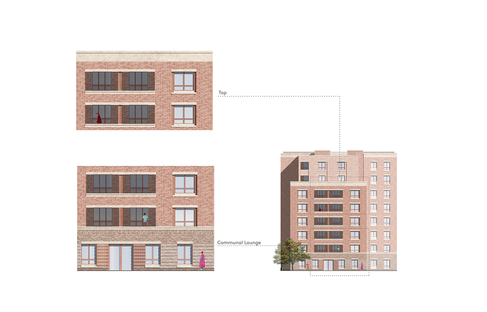 To the east, a building for older adults shares a similar material language and features individual architectural elements including centrally paired balconies that recall the character of nearby homes. Internal layouts are designed to promote a sense of comfort, safety and wellbeing for residents; communal entrances are arranged to frame views into an enclosed courtyard garden, and a triple-aspect communal lounge connects through to a shared outdoor terrace, promoting interactions with neighbours and the outdoors. Spacious family dwellings are contained within a block to the west; placed above a landscaped podium to negotiate a 4m level change and create a better relationship with the street. To reduce energy consumption and keep fuel bills low, the design incorporates a number of passive measures including thermally-efficient fabric and naturally ventilated spaces.