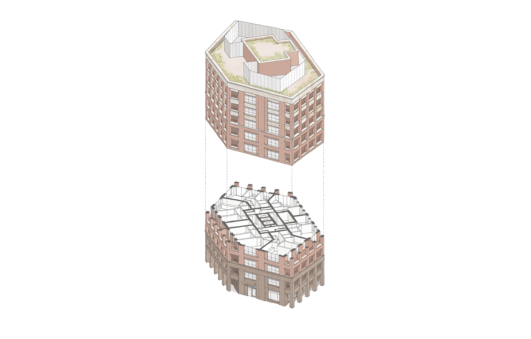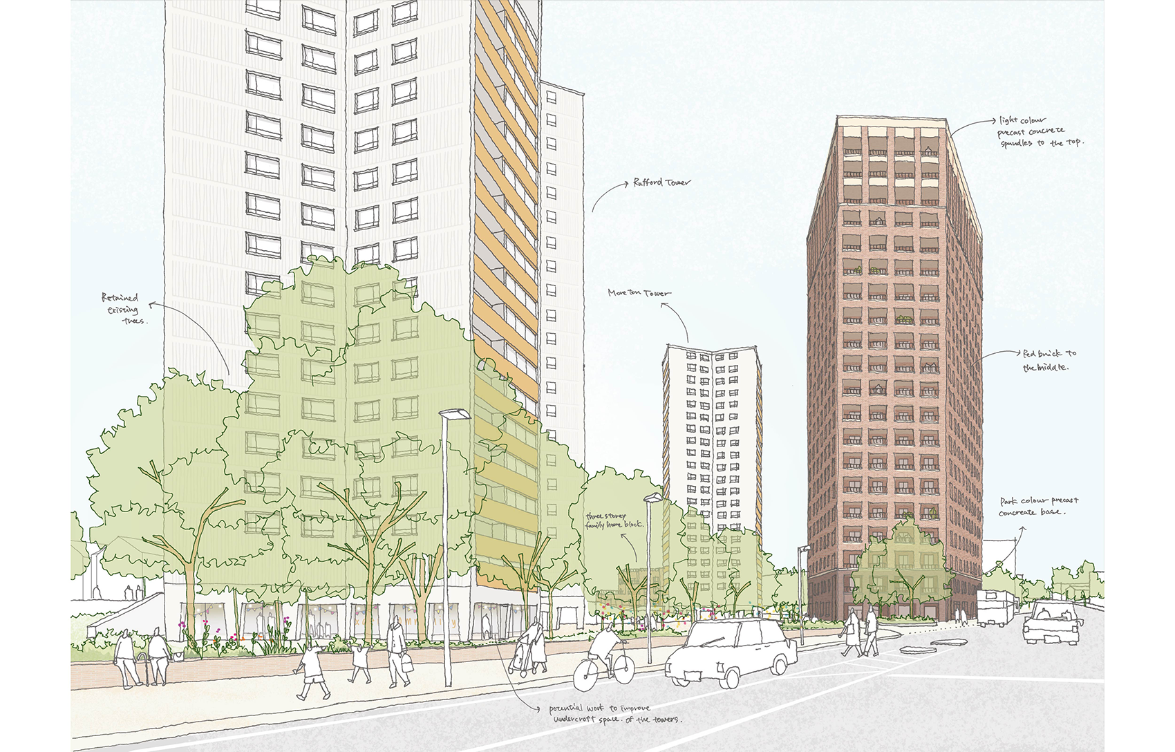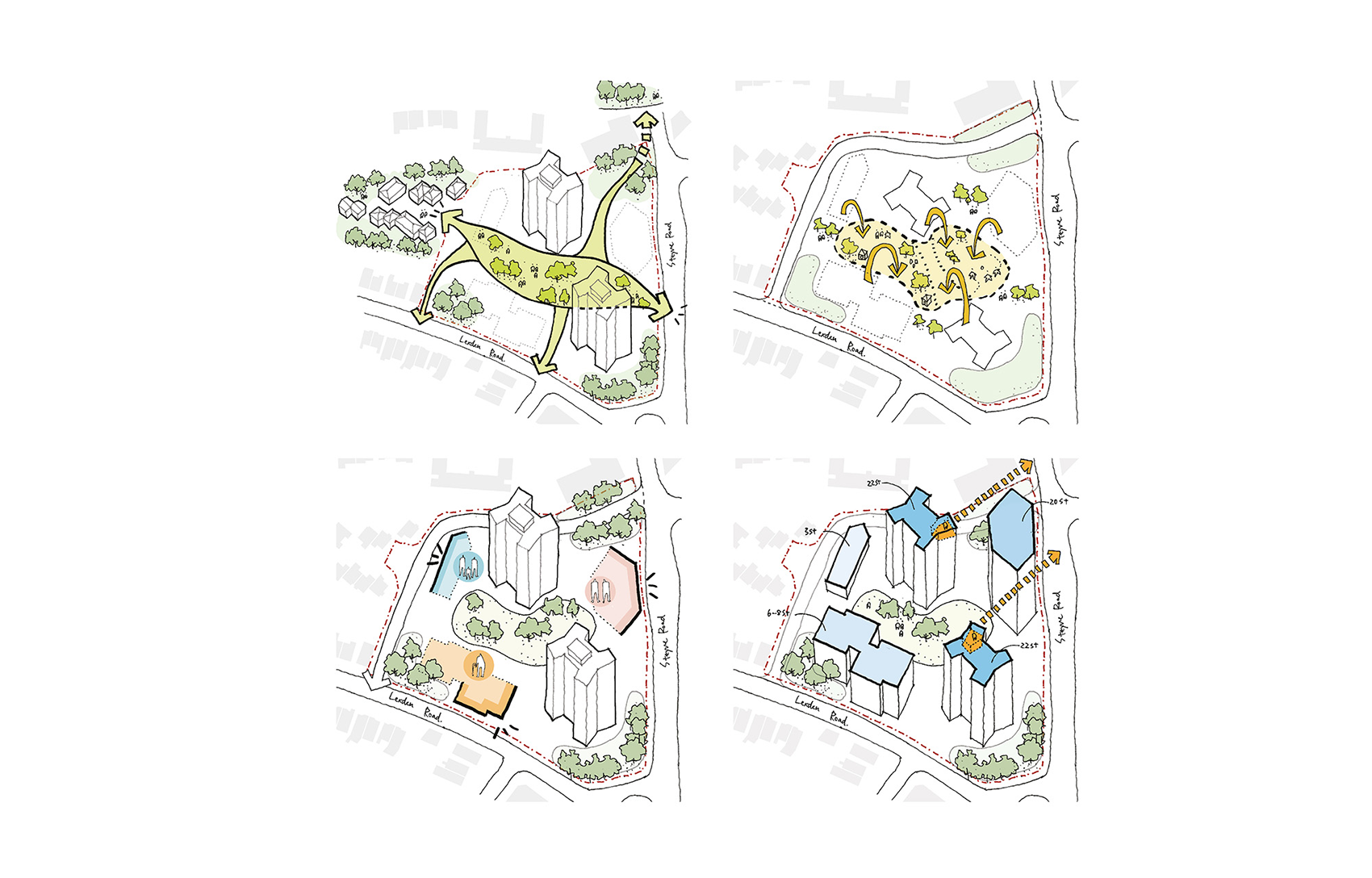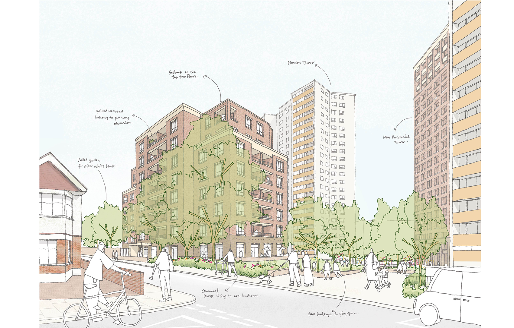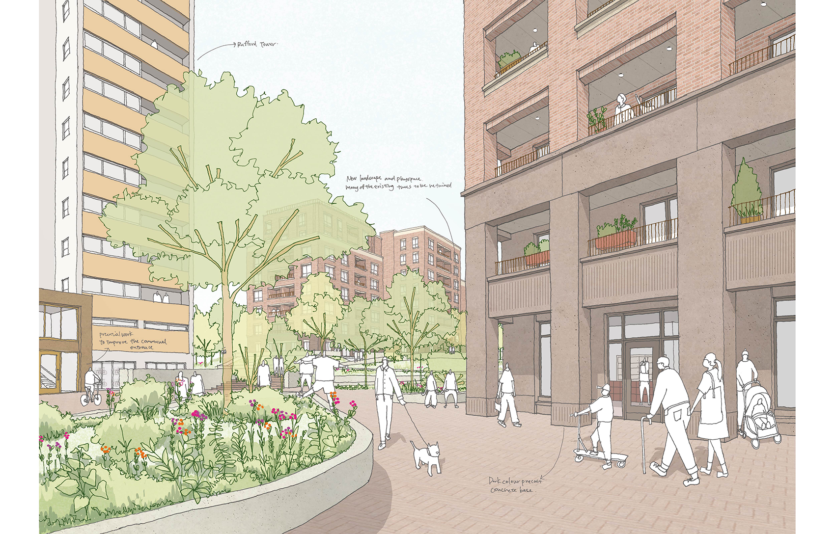 In addition to the creation of new homes, our designs have explored options to re-purpose the large undercrofts of the existing estate buildings with new civic uses to create a more active relationship with the ground floor and public realm. Across the site, new and retained buildings are united within a multi-generational play landscape featuring a network of connecting pedestrian paths and existing mature trees.
