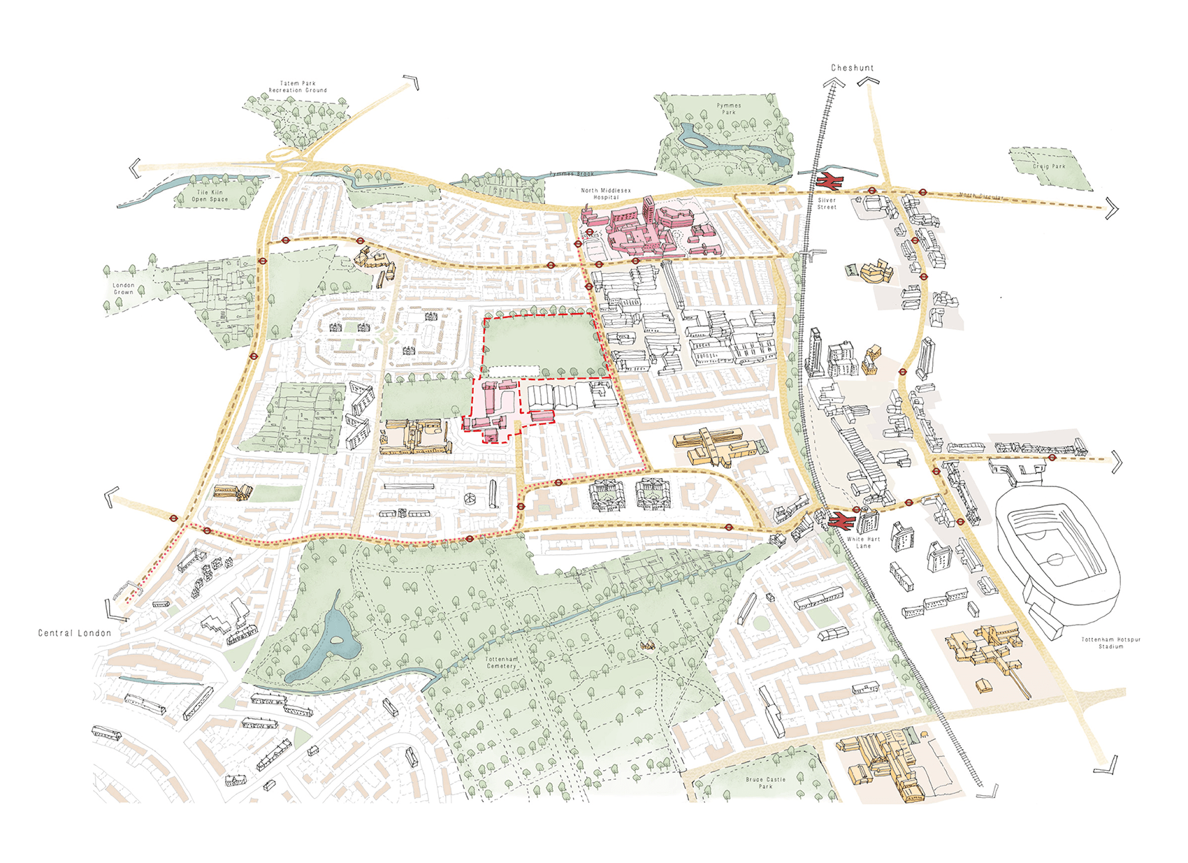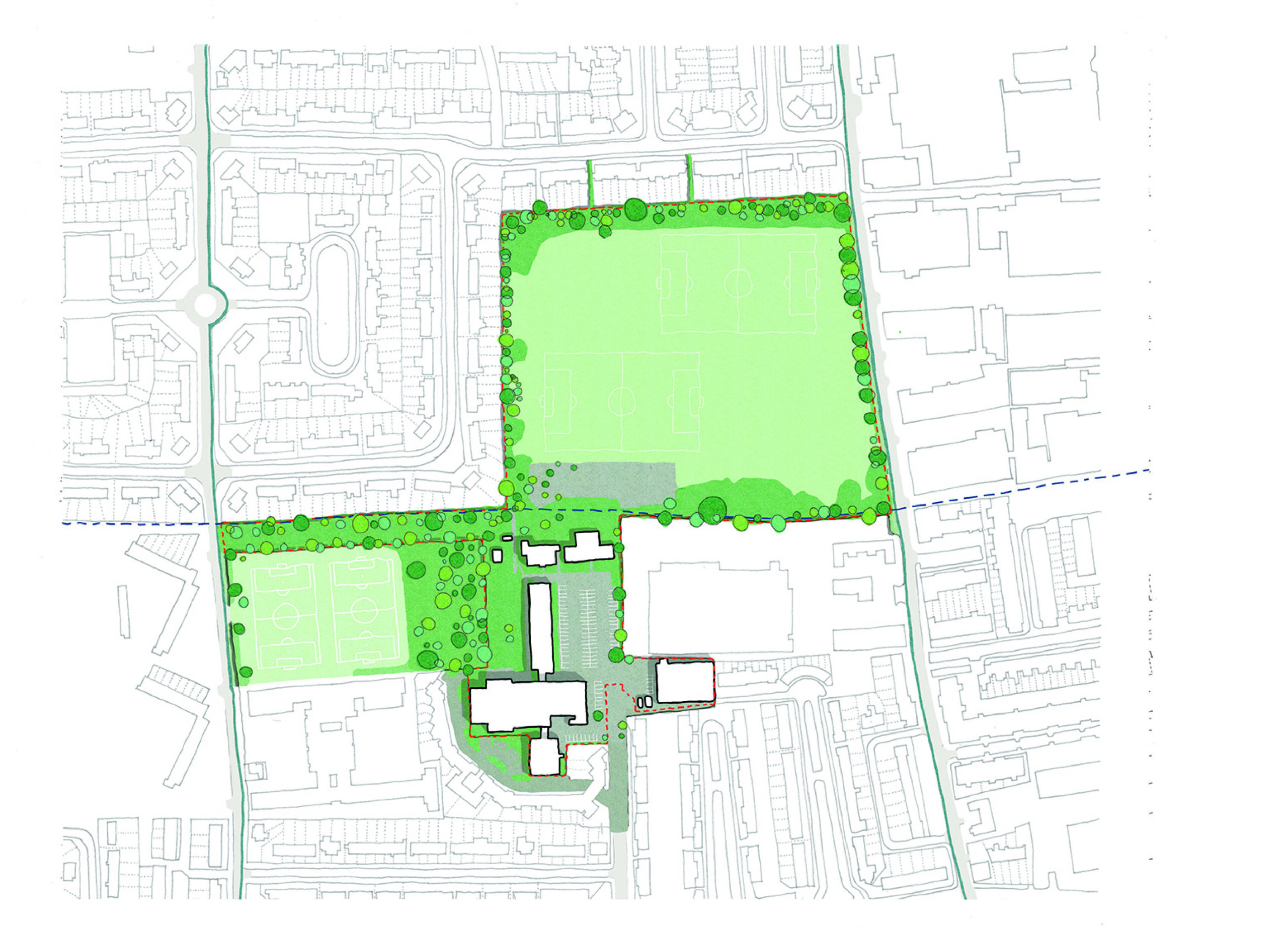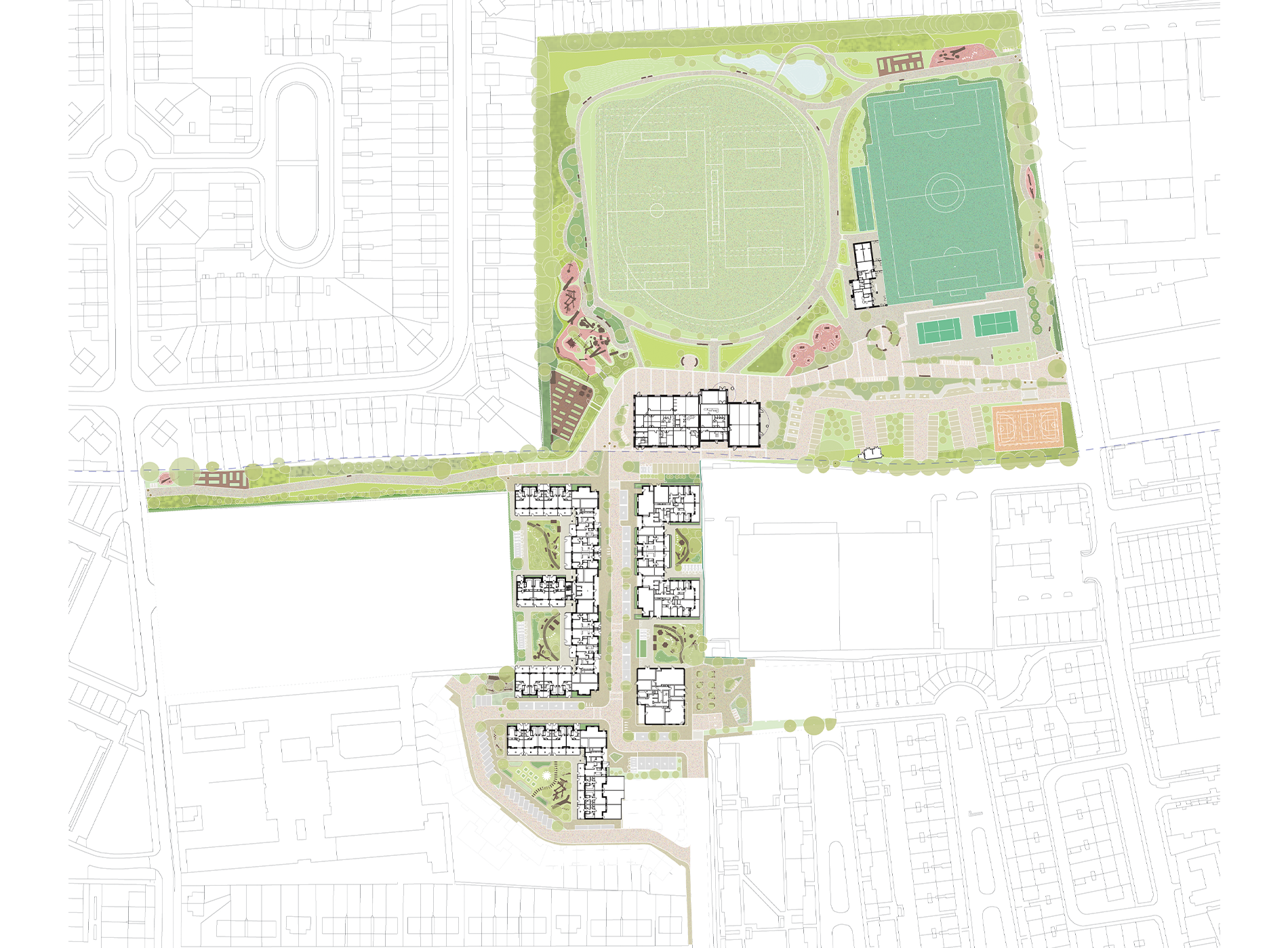Located at the intersection of two London boroughs, Selby Urban Village re-envisions a disused secondary school and underutilised playing fields in North London into a dynamic mixed-use neighbourhood of approximately 202 homes, with new streets, revived open spaces and the re-provision of much-loved community sports facilities.