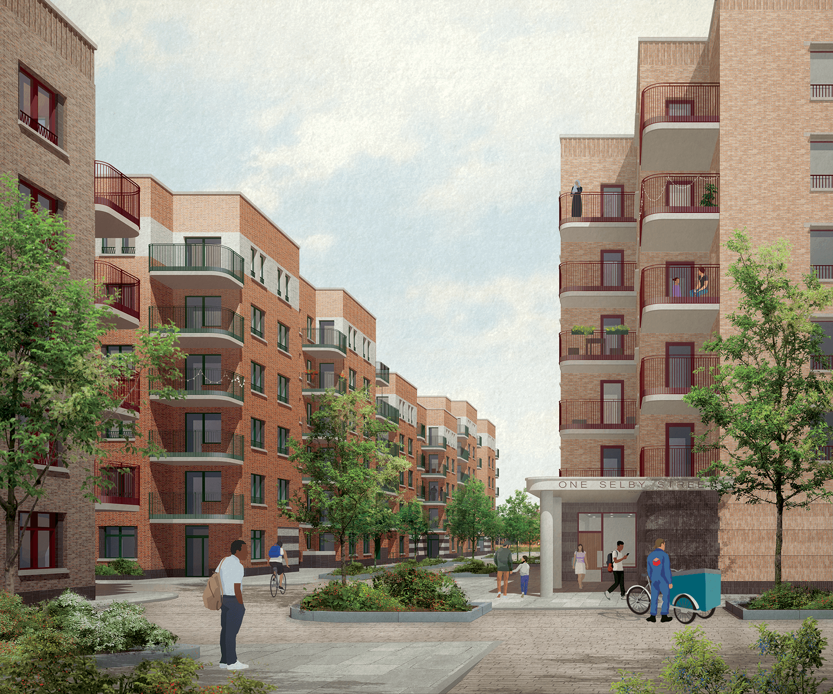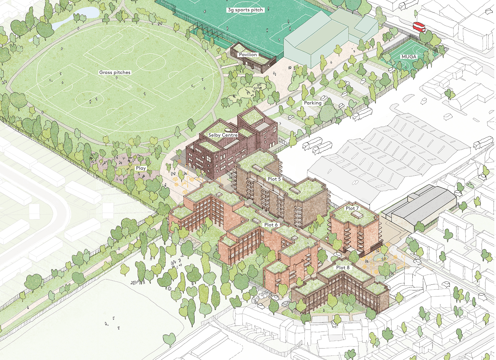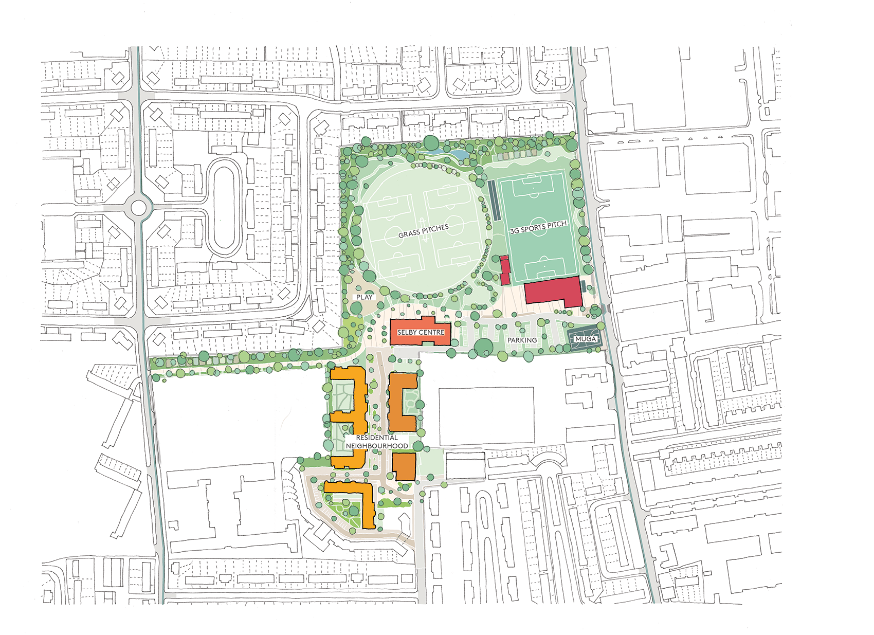 Engagement with The Selby Trust, local businesses and residents has been fundamental in shaping the proposals. Through the careful placement of homes, streets, civic uses and community-focused buildings, the masterplan provides a strongly civic framework that celebrates local identity, supports inclusivity and ties the neighbourhood together.