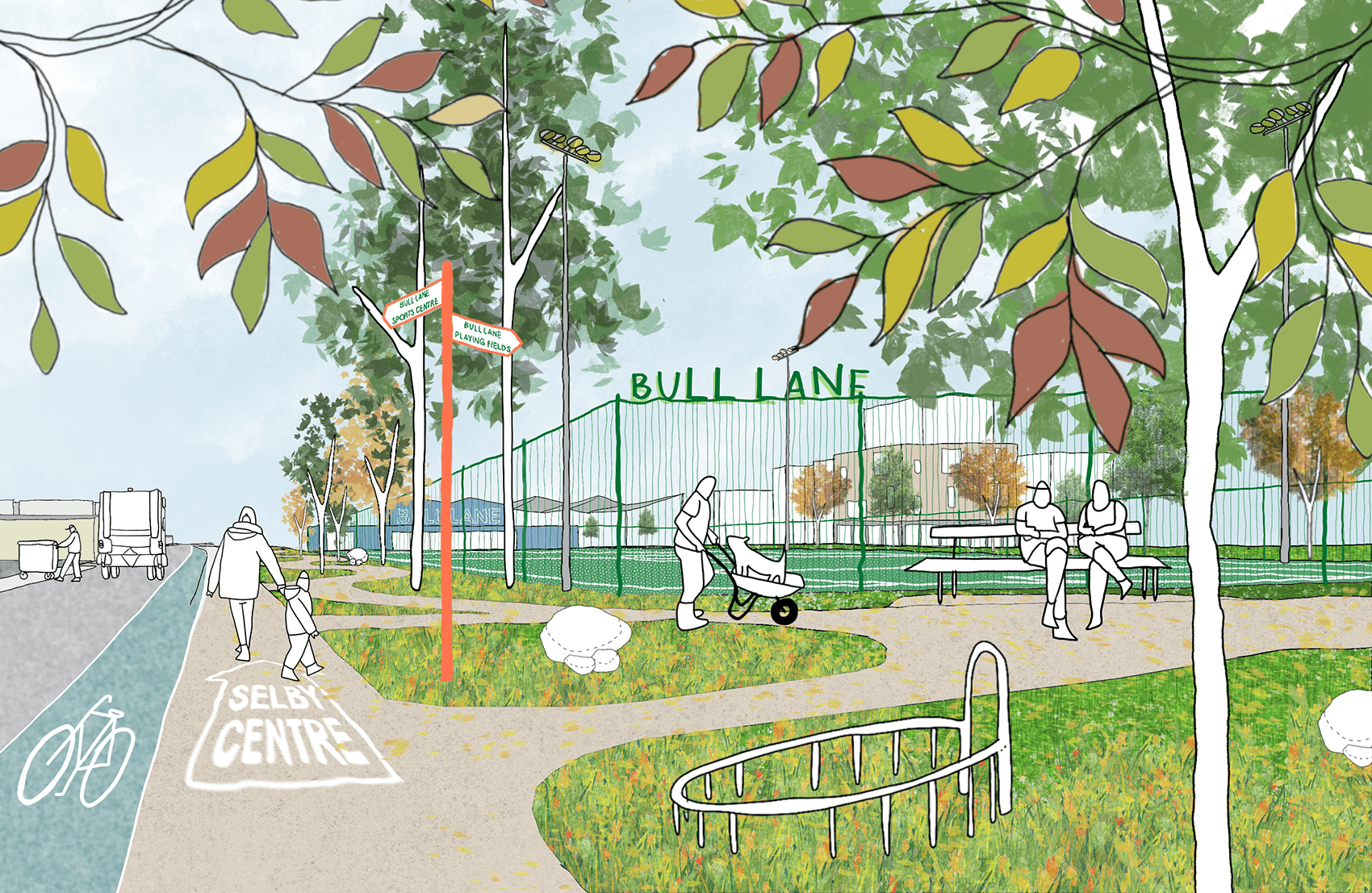 Its ethos as a working social and enterprise hub is conceived as a “factory for community activity”. The new Selby Centre will provide generous, flexible space for a diverse programme of uses including sports and exercise, enterprise, childcare, social events, education and play. Located alongside Bull Lane Playing Fields, the new centre enables activity to spill out into the landscape and allows people to reclaim this important urban green space, which has long been physically disconnected from nearby homes. To break down these barriers, ecological areas and community planting will animate the edges of the fields, while new pedestrian and cycling routes draw people into the park and connect it to the neighbourhood.