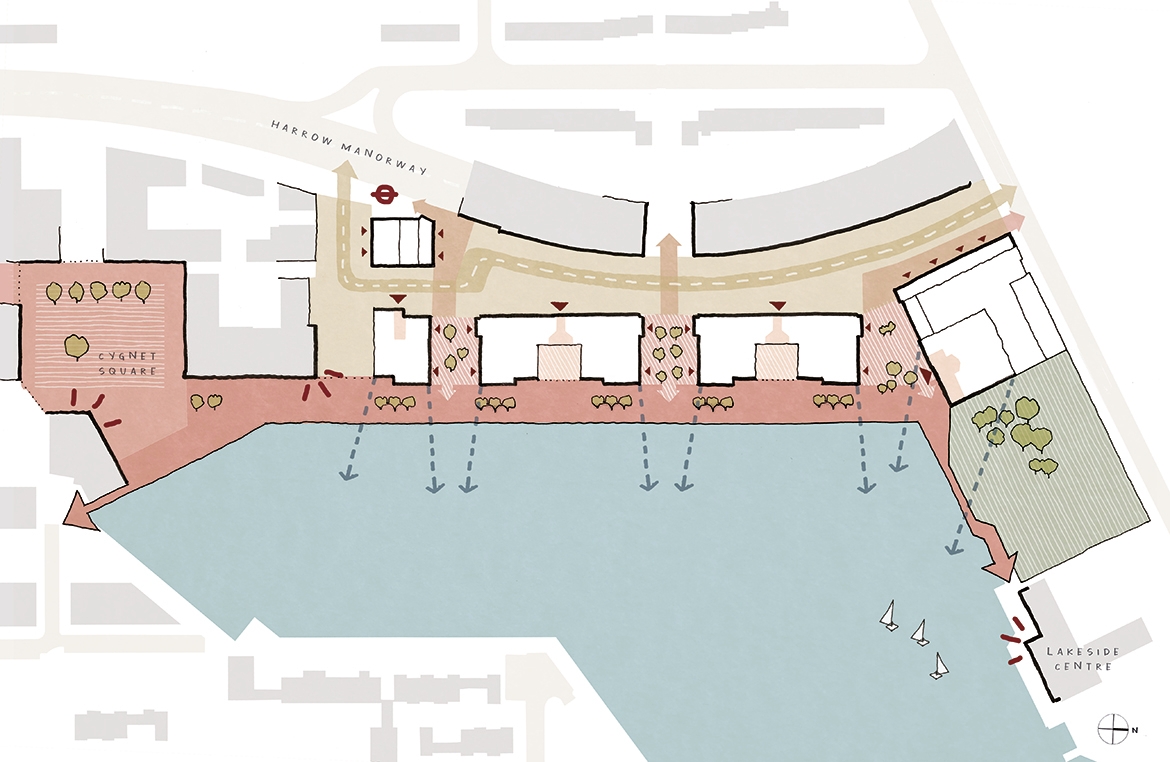 This largely pedestrianised site creates a series of gardens, swales and play spaces linking to a generous public promenade which will allow people to enjoy the waterfront more easily. Using the lake as a focal point, the neighbourhood is formed of a series of elegant brick-built residential buildings configured to front onto the water and provide elevated views from the living spaces.