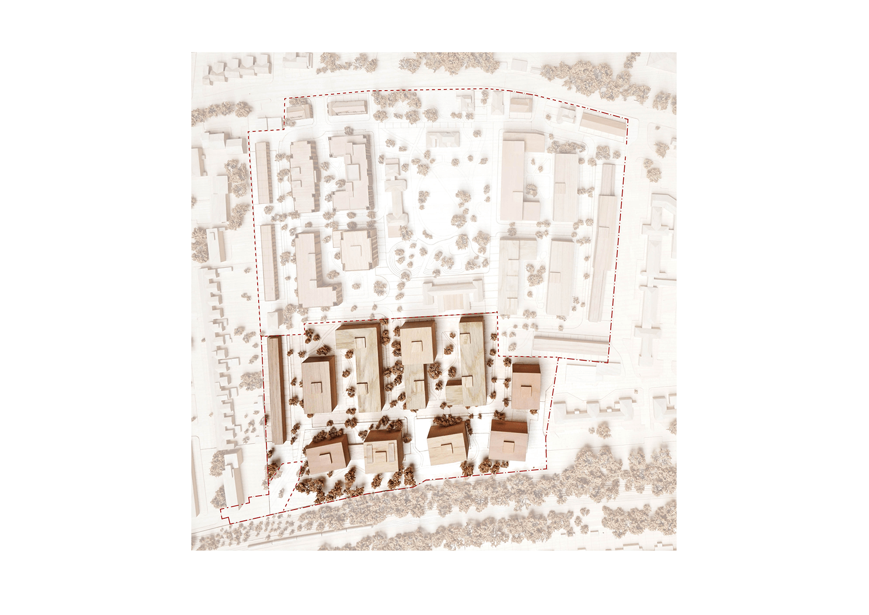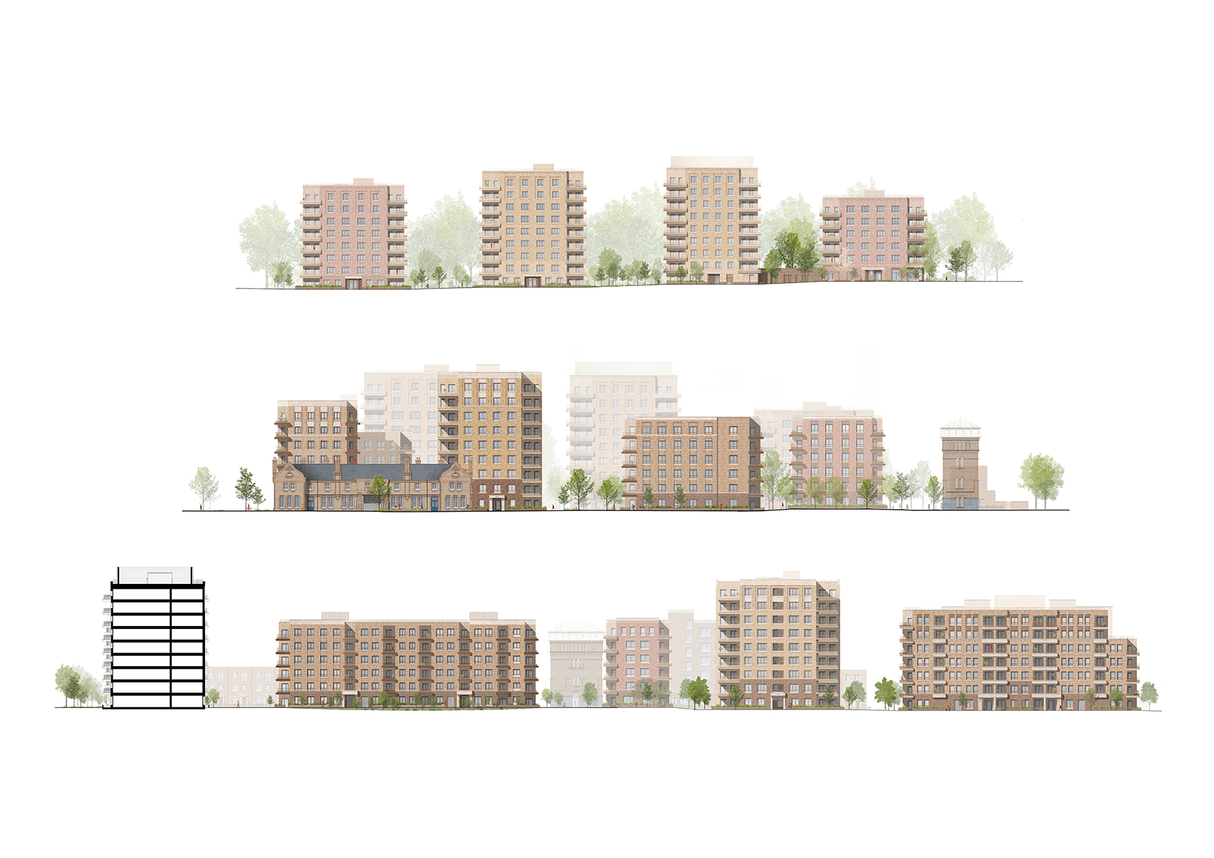 The new buildings of Phases 1B & 2 range in height from three to nine storeys, changing in type, scale and form across the site, in response to the varied site conditions. A row of affordable family houses along the western boundary address the terraced streets beyond, continuing the neighbourhood street established in the first phase and framing the landmark Water Tower. Taller courtyard mansion buildings towards the centre of the plan front on to the central Peace Garden, with generous shared landscape gardens. To the south of the site, villa buildings adopt a looser arrangement, optimising views through the beautiful natural setting of the adjacent protected (SINC) woodland and maximising dual aspect homes.