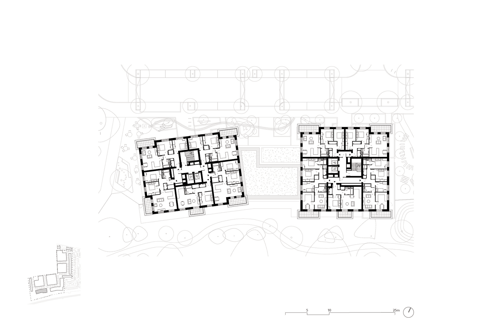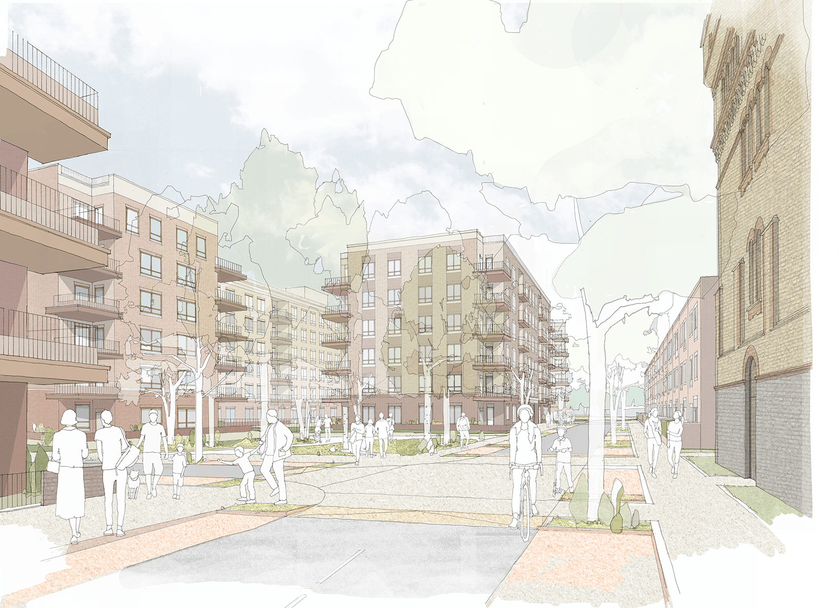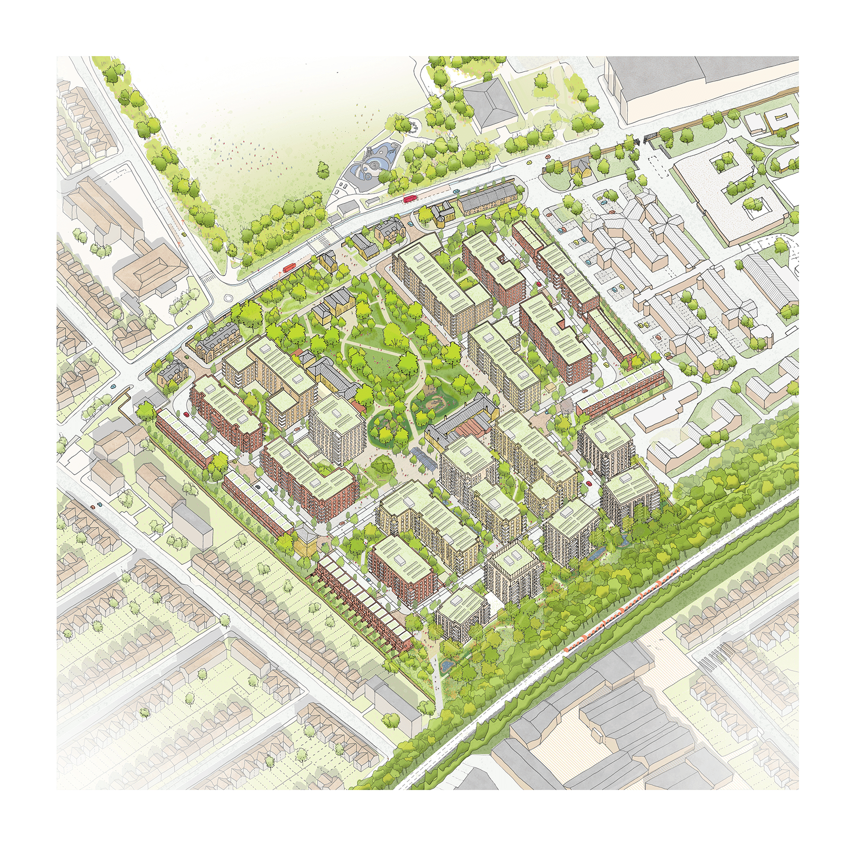 Running north-south through the centre of the site, a new ‘Green Link’ extends the character of the woodland through to the Peace Garden with a generous linear swale. Bridges cross the swale playfully to meet residential entrances and complement play paths which interweave the rich SuDS landscape, creating homes that are healthy, embedded in nature and distinctive.