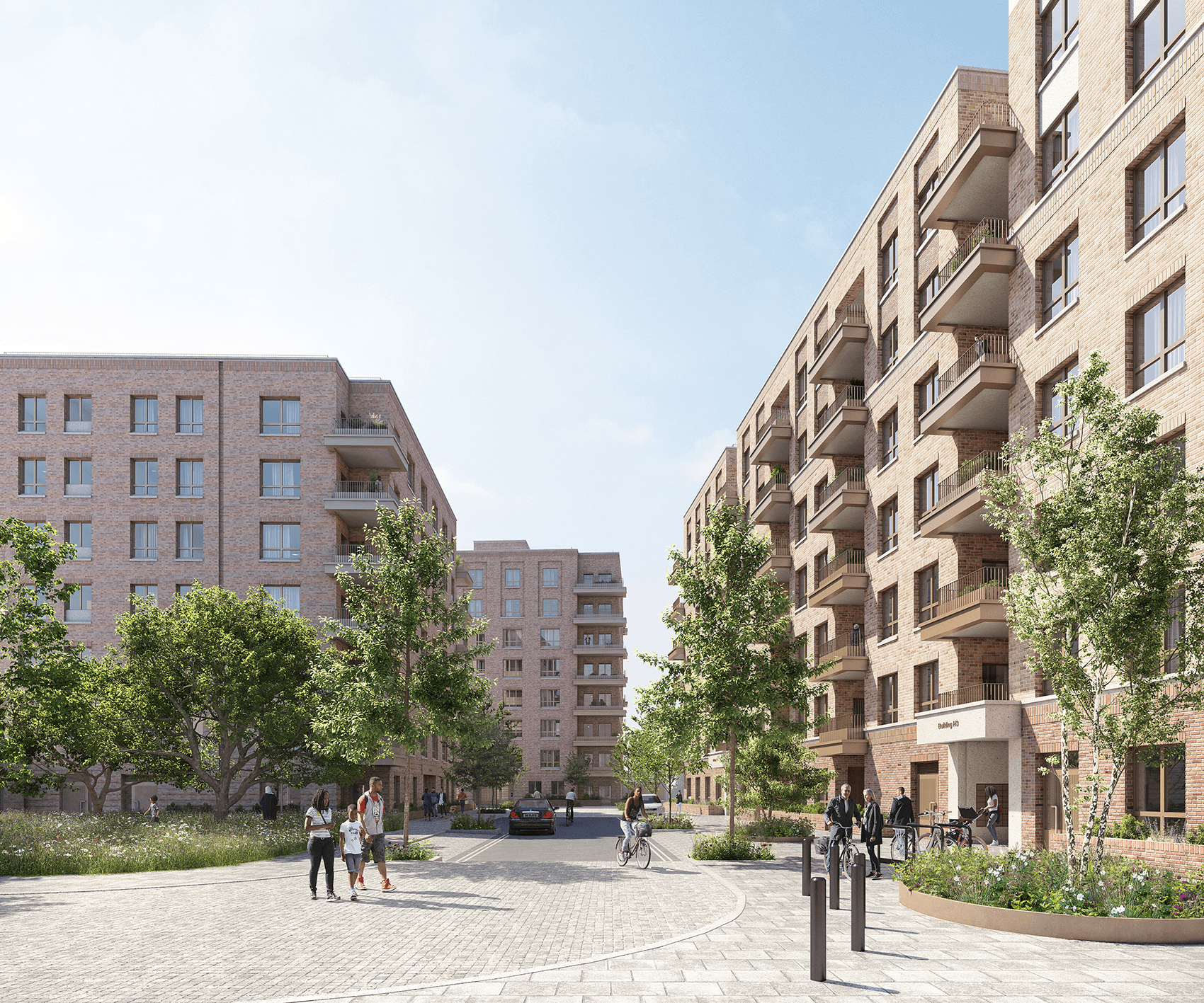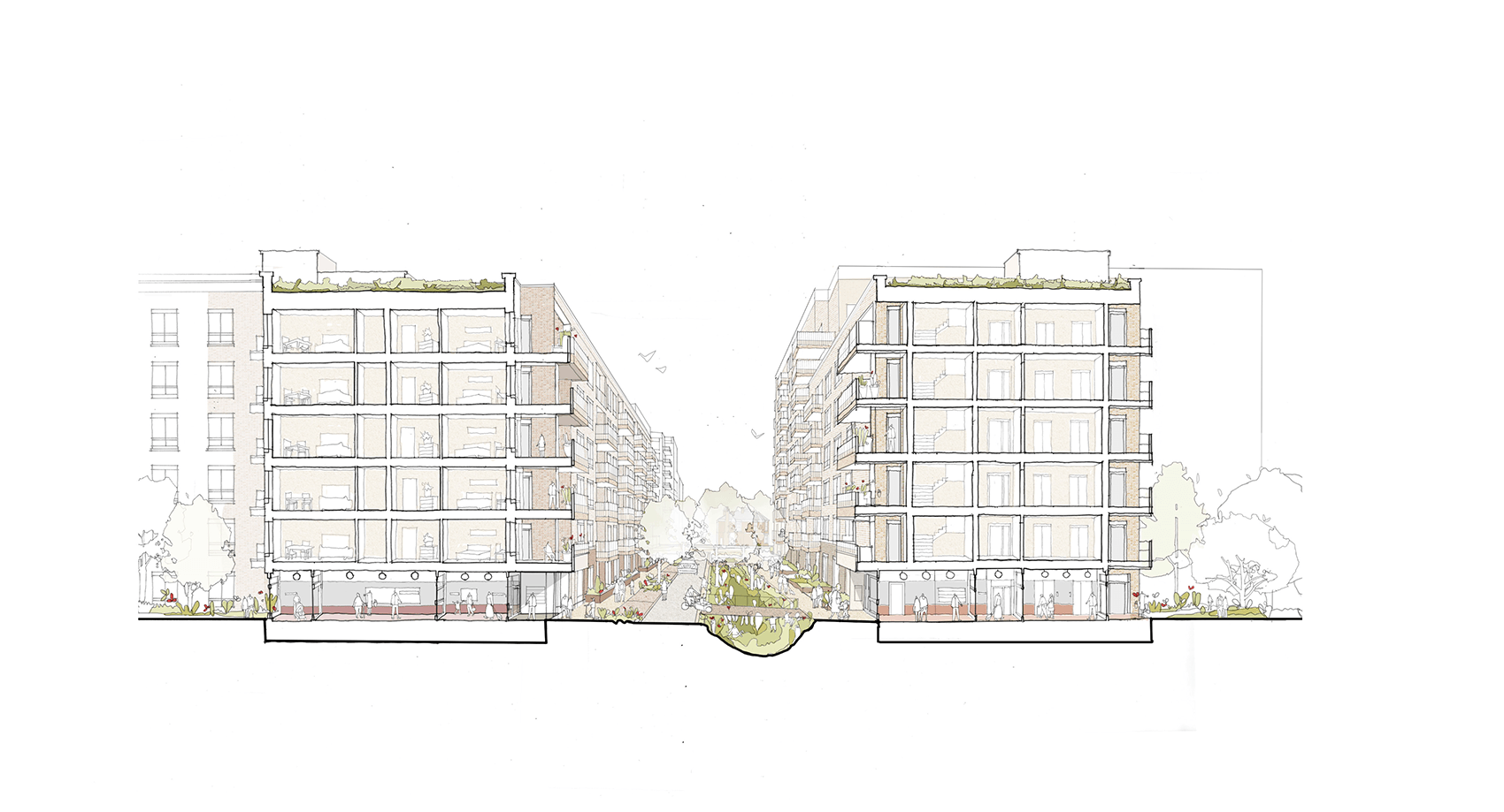 In the site’s southwestern corner, a public square and commercial unit greet a new pedestrian and cycle through-route to Warwick Gardens and the high street amenities and transport links of Green Lanes beyond. This new route will provide permeability through this previously isolated hospital site for the wider community, ensuring that the new development is an integrated part of the city as well as improving neighbourhood-wide active travel connections.