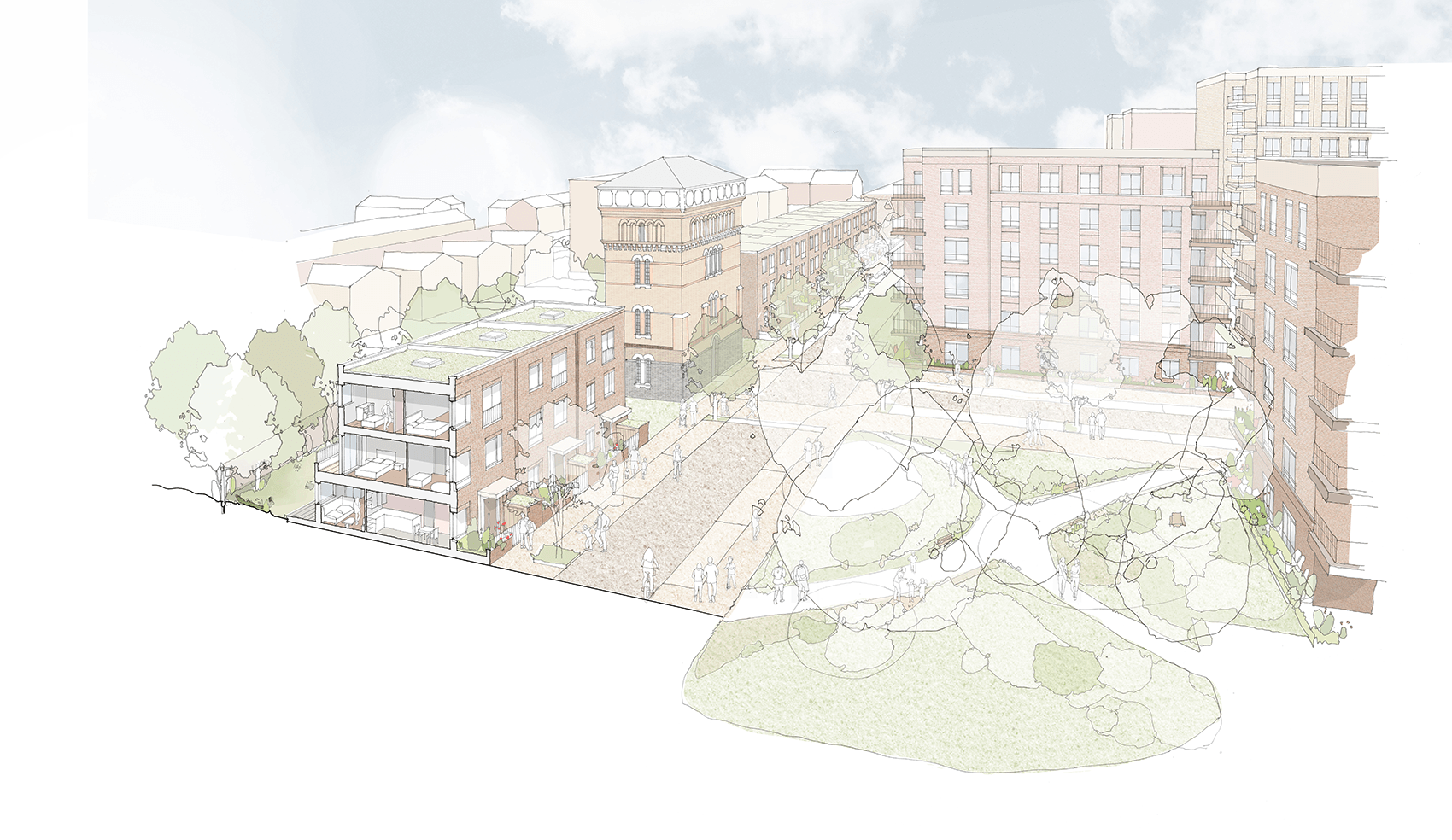 A substantial 73% of the new homes in Phase 1B & 2 will be affordable, including 58 homes for a local Community Led Housing group. Completing the southern half of the overall masterplan, the nine new apartment buildings and fourteen family houses will sit alongside restored Victorian-era hospital buildings including the Water Tower and Admin Building. All buildings are united through a complementary brickwork palette and architectural language, inspired by the distinctive character of the Victorian hospital and surrounding area, ensuring a fully tenure-neutral approach and continuing the ambition of the first phase as set out in the approved Outline Masterplan and Design Code.