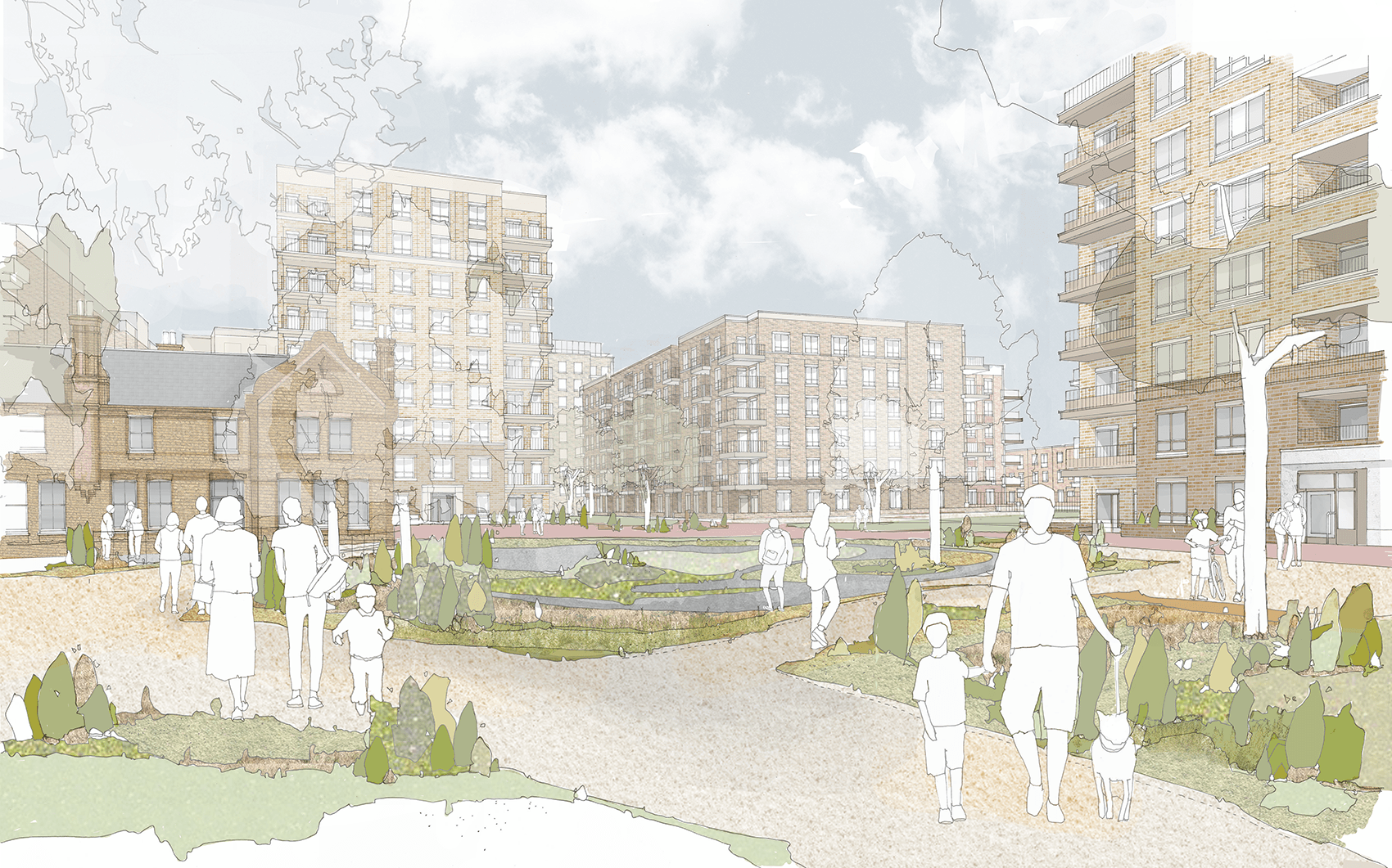 Our masterplan has been shaped by the site’s existing biodiversity and wealth of protected, mature trees, which was originally laid out by a Royal Botanic Gardens, Kew horticulturalist in 1920. Existing landscape and ecological assets are carefully enhanced, informing character, providing amenity value and ecological benefits, while retaining connections with the site’s heritage.