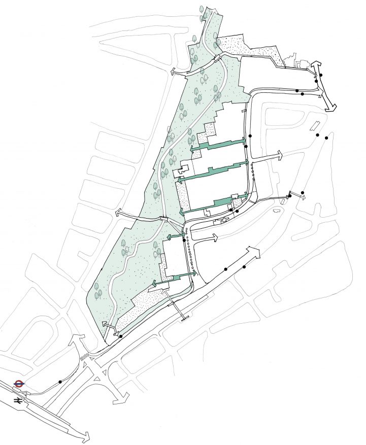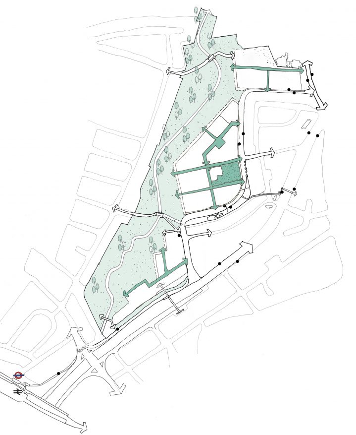 Built in the 1970s, the original estate has long suffered from a fragmented layout leading to ill-defined public spaces and marooned shops and services which are not easily reached on foot. This lack of connectivity within the estate is compounded by its location at the intersection of the busy North Circular motorway to the east and south and by large industry and retail to the north, resulting in an urban island condition.