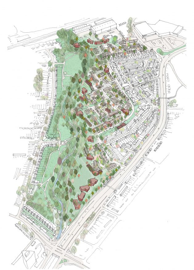 From our two initial masterplan options, plans for strategic infill will be taken forward by the council. In this scenario, 370 new affordable homes will be woven into the existing estate and fill the gaps in the landscape to create not only more dwellings, but a more coherent neighbourhood. We are now leading Phase 1 of the masterplan and are continuing to work with the community to progress designs.
